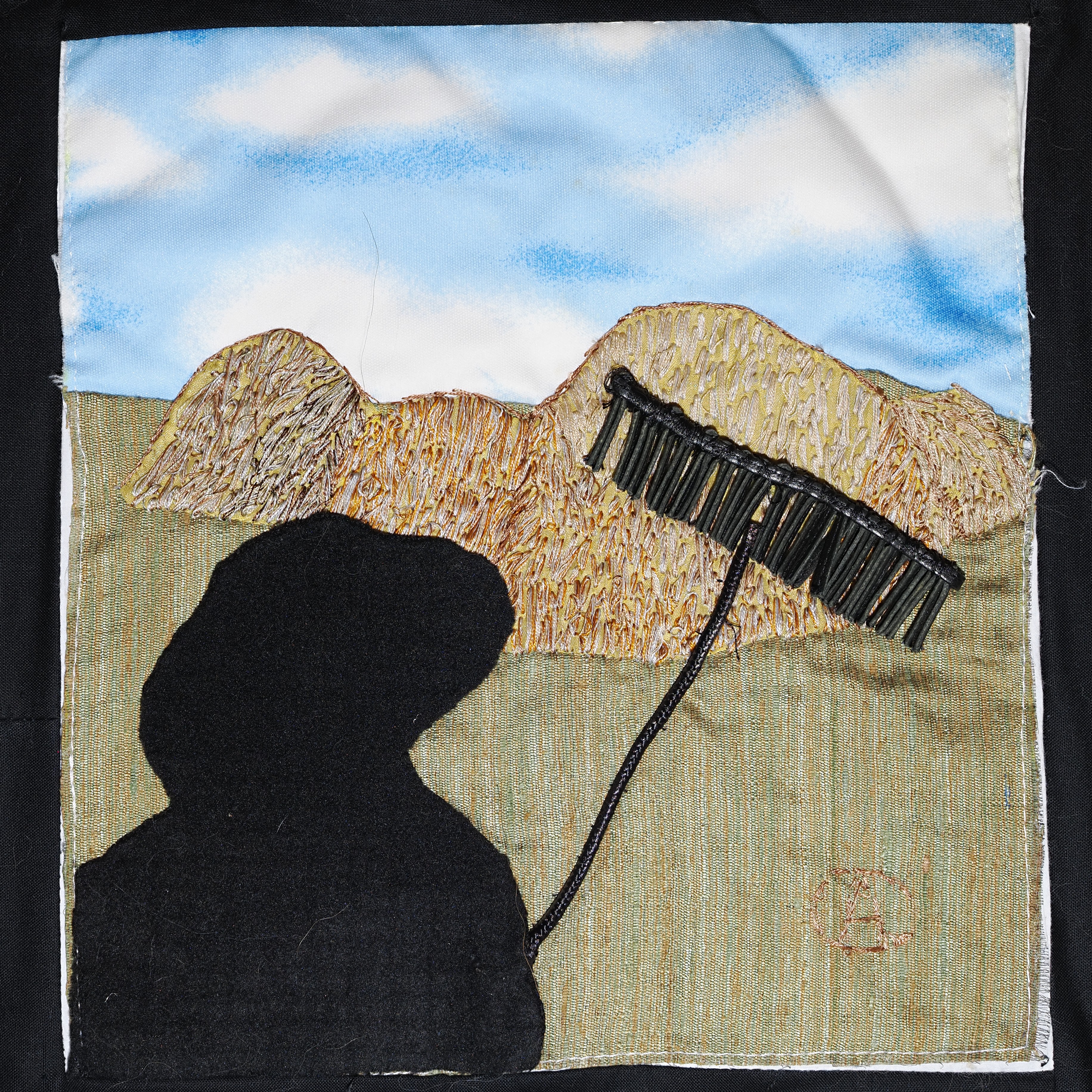 Depicting the shape of the farmer and his hay rake in silhouette is a representation