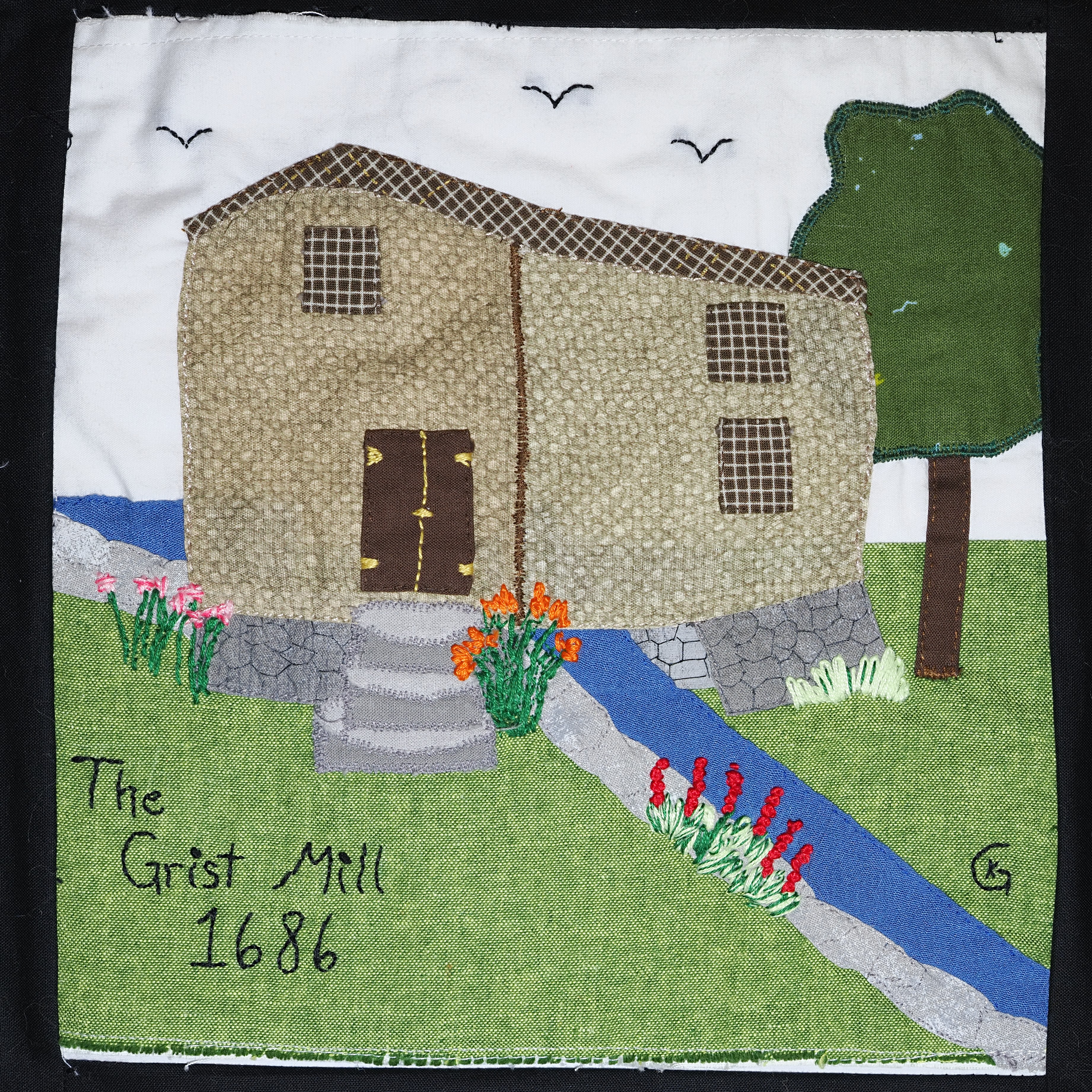 fabrics to represent the traditional shingled mill, and I used grey for the rock walls