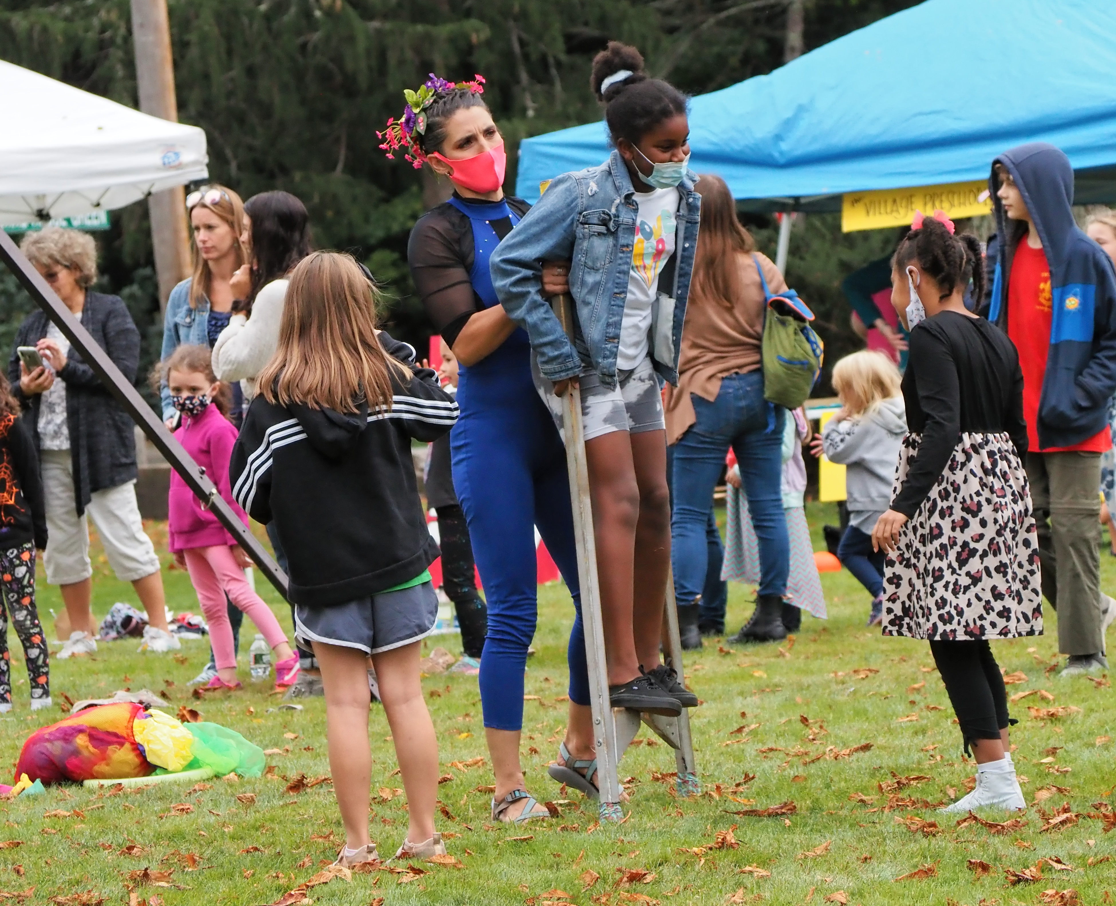 Leah Abel teaching kids to use the stilts |